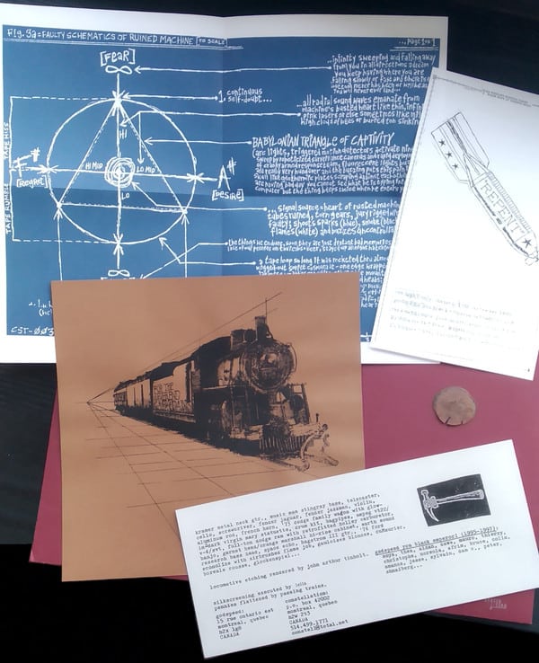 Inserts: locomotive etching. An envelope containing the credit sheet, a handbill from a previous show, a blueprint of “faulty schematics for ruined machine” and an American penny flattened by a train.